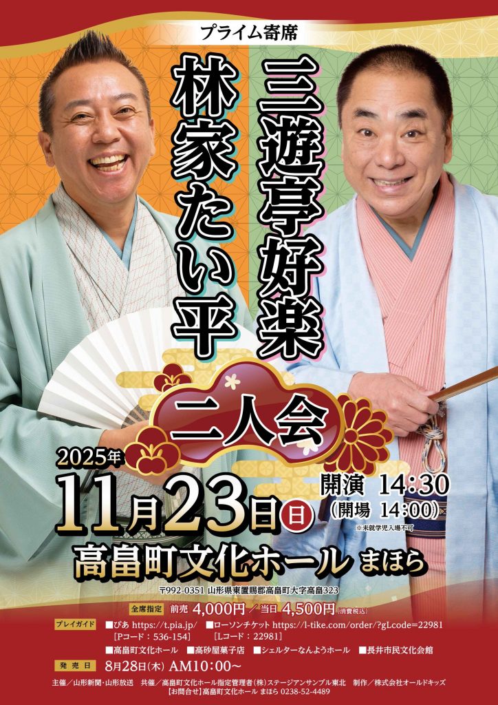 落語界の人気者、三遊亭好楽師匠と林家たい平師匠が、 高畠文化ホール「まほら」にやってきます。 語りの妙で笑わせる好楽師匠。 明るく親しみやすいたい平師匠。 二人の掛け合いが、会場を笑いの渦に巻き込みます。 この二人が織りなす、笑いと人情の至福のひとときをお楽しみください。 ▶日時:2025年11月23日(日) 開場:14時、開演:14時半 ▶会場:高畠町文化ホールまほら ▶チケット:前売り4,000円、当日4,500円 (未就学児の入場はご遠慮ください) 高畠町文化ホールや地元プレイガイドでお求めいただけます 笑いの渦に包まれる秋の午後、ぜひお出かけください!