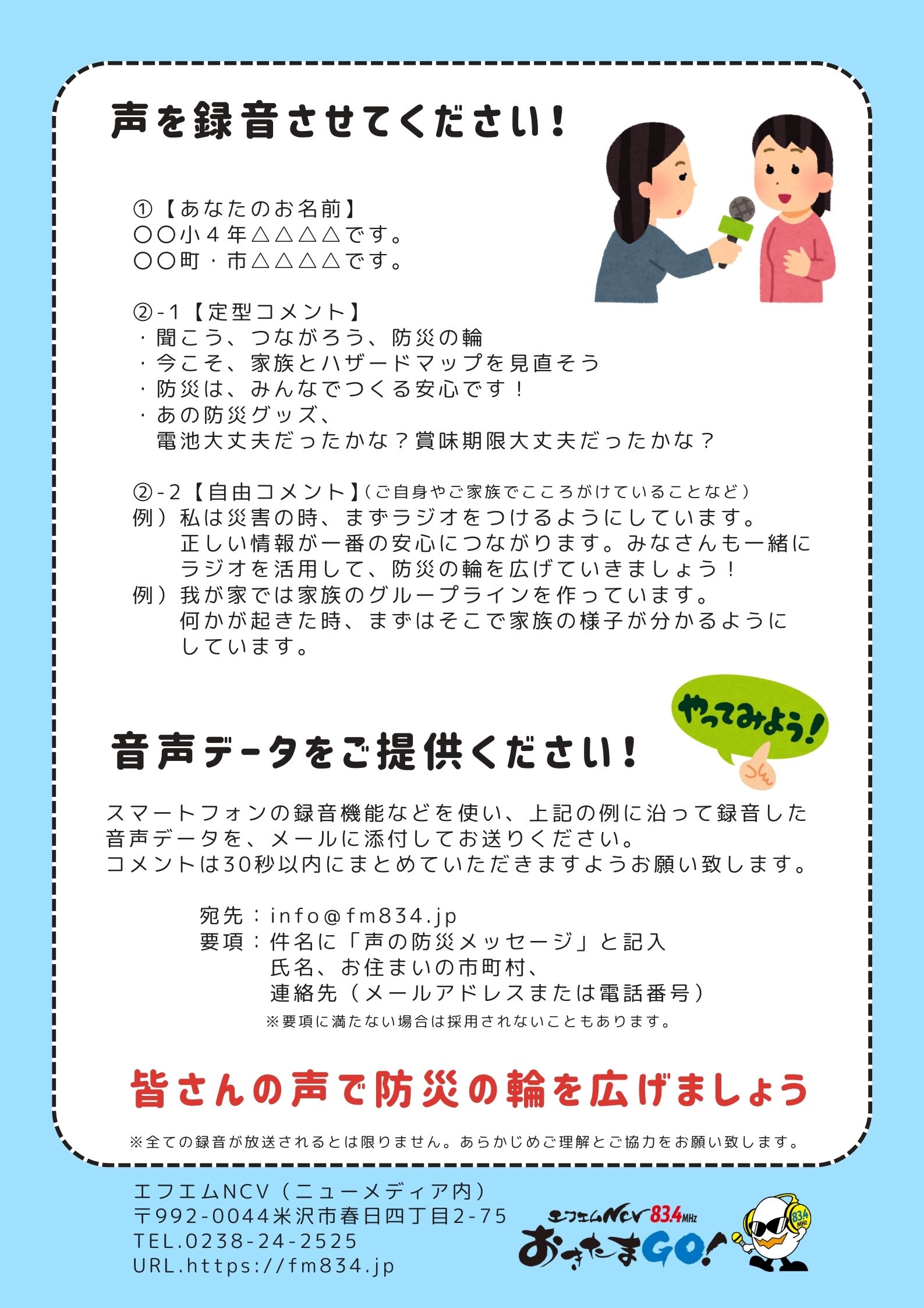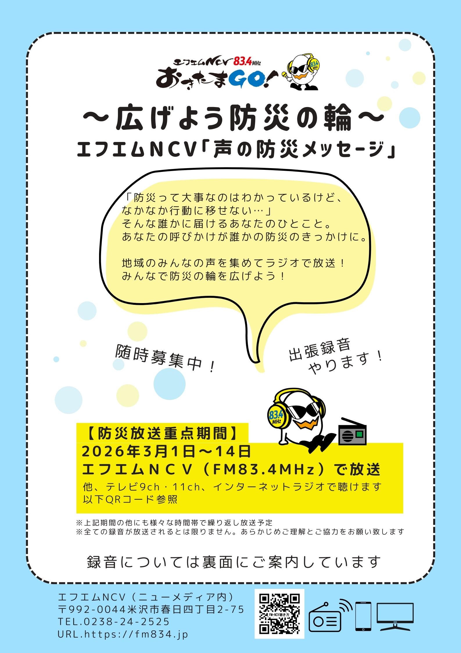 エフエムNCVでは地域の防災意識の高揚を目的とし、地域の皆さまの声を集め、放送する、「声の防災メッセージ」を企画しました。