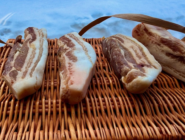 例年二月は、雪がまだまだ残っていて気温も低く、生ベーコン、パンチェッタを外で干しています。日陰に塩漬けした生の豚肉を干し、乾燥させるのに最高でなんですが、今年はどうも気温が高いように感じます。